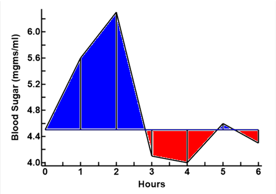 In this case, all sub-areas above this reference value represents raised glucose levels, a failure of insulin response to the glucose load, and all sub-areas below this reference value represents reduced glucose levels, an excessive insulin response.