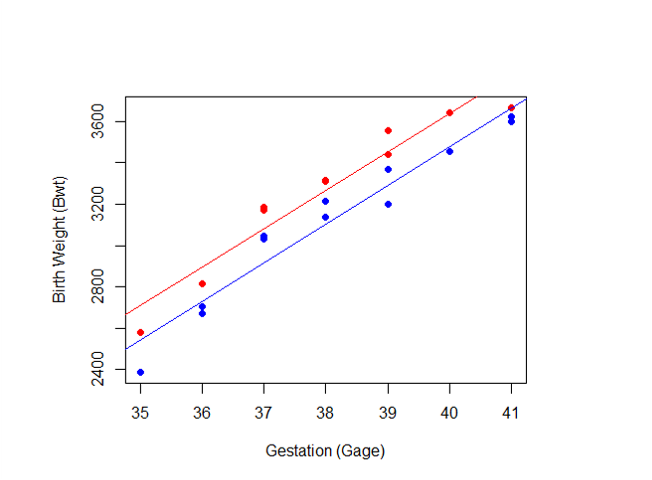 abline(lm(dfG$Bwt~dfG$Gage),col="blue") # regression line for G