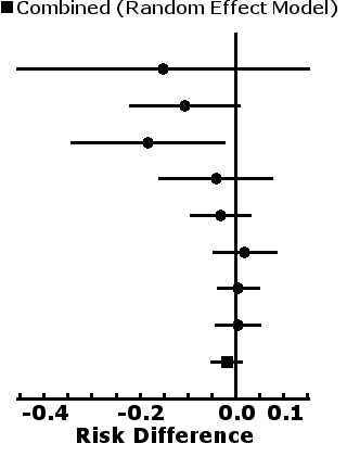 combined summary effect (square dot) and its 95% confidence interval placed at the bottom