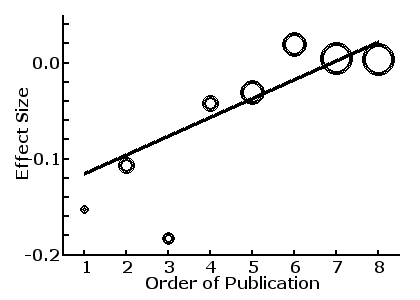 the sample size of the early studies were small and unstable compared with latter studies, and we expect that the Effect Size