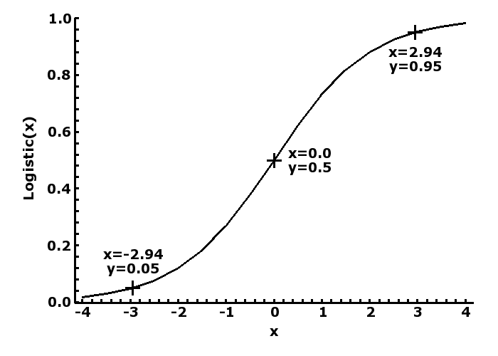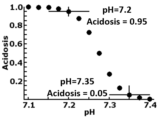 An example of this is shown in the plot to the right, which translates the measurement of fetal blood pH into a diagnosis of acidosis, by firstly rescale the normally accepted non-acidosis value of 7.35 to -2.4444 and its logistic value of 0.05 and the normally accepted acidosis value of 7.2 to 2.4444 and its logistic value of 0.95. This rescaling changes an otherwise normally distributed measurement into the bimodal one of acidosis and non-acidosis, compressing the values less than 7.2 and more then 7.35, while stretches the values in between. Neurone The processing unit in a Backpropagation neuronet is the perceptron, based on the concept of the nerve cell the neurone. The unit receives one or more inputs (dendrites), process them to produce an output (axon). Mathematically, this is divided into two processes.