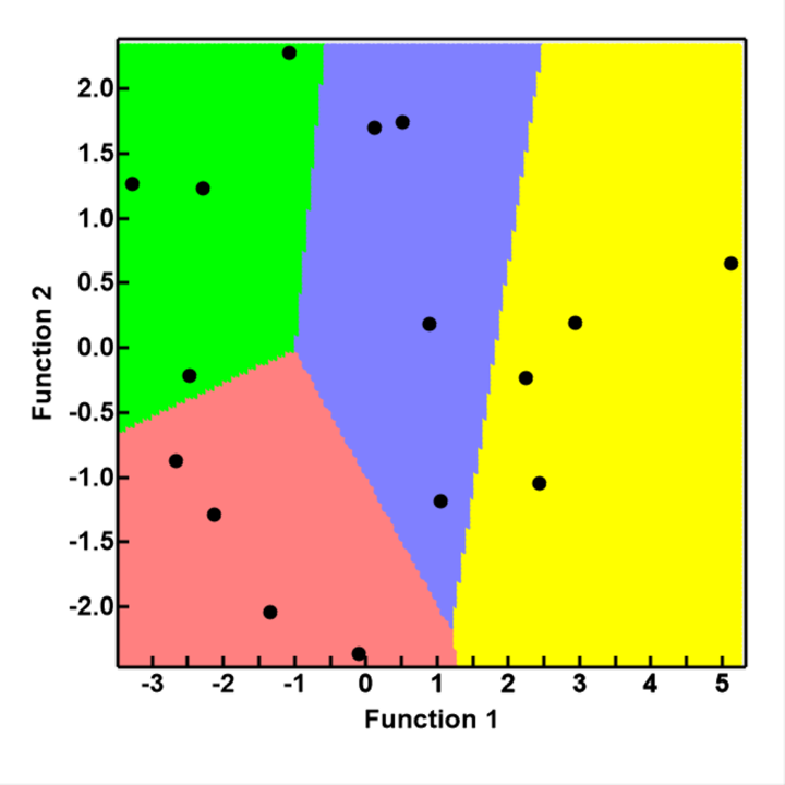 Each row of the modelling data is analysed in turn. The last column is the designated group, and other columns are the predictor variables. All functions (3 in this example) are used in calculations, although the third function is non-significant and, if ignored, will only make trivial differences to the results