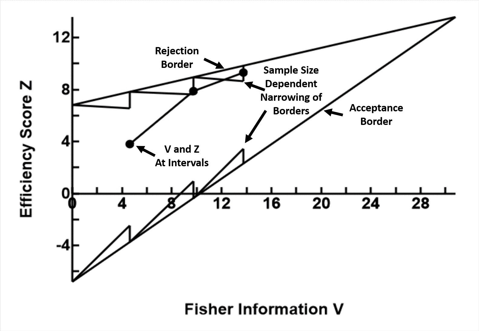 The baseline and two borders forms a triangle. While the V / Z plot remains within the triangle, no decision should be made other than to collect more data. If the plot crosses the rejection border, the null hypothesis is rejected (significant difference exists). If the plot crosses the acceptance border than the null hypothesis is accepted (no significant difference).