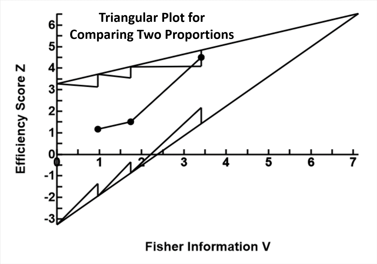 The Triangular test is a sequential statistical method for comparing two groups, based on the relationship between Fisher's information V (expression of the quantity of data) and the efficiency score Z (expression of the effect size). The calculation of V and Z depends on the nature of the measurements concerned, but the interpretations of their relationship are the same. V and Z can be calculated at any time during the study.